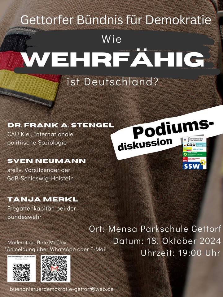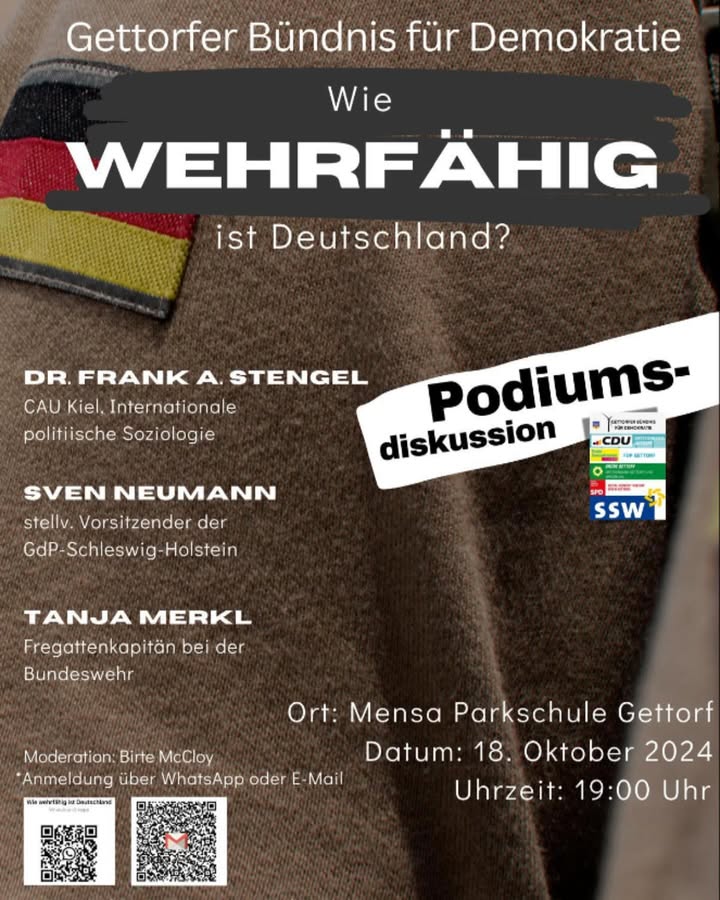🌟 BÜNDNIS FÜR DEMOKRATIE GETTORF 🌟 📅 PODIUMSDISKUSSION AM 18. OKTOBER 2024, 19:00 UHR in der MENSA PARKSCHULE GETTORF! „Wie wehrfähig ist Deutschland?“ 🗓️ Am Freitag, 18. Oktober 2024, um 19 Uhr, diskutieren Tanja Merkl, Fregattenkapitänin bei der Bundeswehr, Sven Neumann, stellvertretender Vorsitzender der Gewerkschaft der Polizei @gdp_schleswig.holstein sowie Dr. Frank Stengel, Dozent für Soziologie an der @kieluni in der Mensa der Parkschule Gettorf. Moderiert wird der Abend von der Gettorferin Birte McCloy. 🤝 Das überparteilich arbeitende Gettorfer Bündnis für Demokratie lädt herzlich zur Podiumsdiskussion mit dem gleichnamigen Titel ein. Im Bündnis arbeiten Vertreterinnen und Vertreter von CDU, SPD, Bündnis 90/Die Grünen, FDP und SSW aus Gettorf gemeinsam an Projekten für #gettorf . Inhaltlich wird es um eine breite Palette von Fragen rund um die Themen Wehrfähigkeit und Friedenserhalt gehen. Die Teilnehmenden haben die Möglichkeit, eigene Fragen an die Diskutierenden zu stellen. Um planen zu können, bitten wir um Anmeldung für den Abend über WhatsApp unter Tel. 0176 456 57924 oder per E-Mail unter buendnisfuerdemokratie-gettorf@web.de Wir freuen uns auf einen spannenden und konstruktiven Austausch! 🗣️🇩🇪 #Demokratie #Podiumsdiskussion #Gettorf #Wehrfähigkeit #Frieden